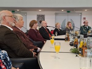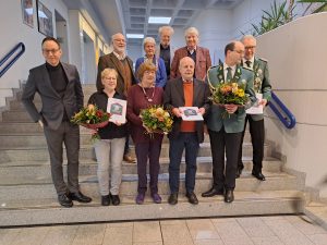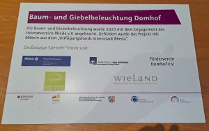 Sie strahlten zwar schon länger, die Giebelbeleuchtung und der Baum vorm Domhof, aber am 27.09.2024 wurden sie im Rahmen einer kurzen Zeremonie in der Bibliothek des Heimatvereins vom Bürgermeister Theo Mettenborg eingeweiht. Chantal Visser vom Quartiersmanagment Rheda und er überreichten dem Vorstand des Heimatvereins eine Tafel mit den Namen der Sponsoren.